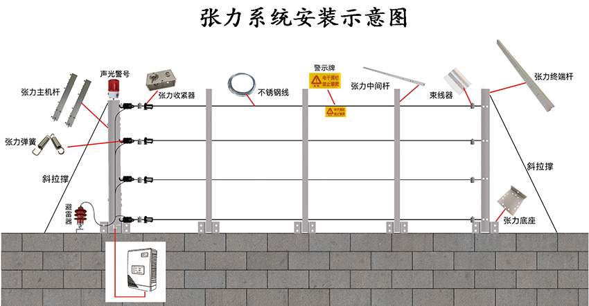 現在來說下張力電子圍欄,前面也說瞭(le)張力圍欄和脈沖圍欄最大的區别就是張力圍欄不具備有高壓脈沖電擊功能,報警和阻擋同樣具備瞭(le)。張力圍欄的報警方式是當前端的圍欄的拉力值發生瞭(le)改變就會産生報警信号 。由於(yú)張力圍欄是一種物理性的報警方式 ,所以張力圍欄的每個的防區控制長度就相對較短一般在40米以内爲一個防區。由於(yú)防區控制長度較短,在同周長的項目上整體的造價成本相比脈沖圍欄要高一些。