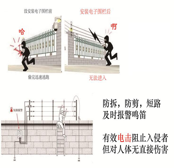 電子圍欄的出現徹底改變瞭(le)人們對安全防護工作理念的認識。原有的安防措施,主要靠值班人員看護,紅外監測等。屬於人防。誤報率高,維護費用大,人爲因素多,防護效果不明顯 。都是以案件發生後,報案,抓捕爲主。事件已發生,已造成經濟損失,造成社會影響 ,並(bìng)很難破案。